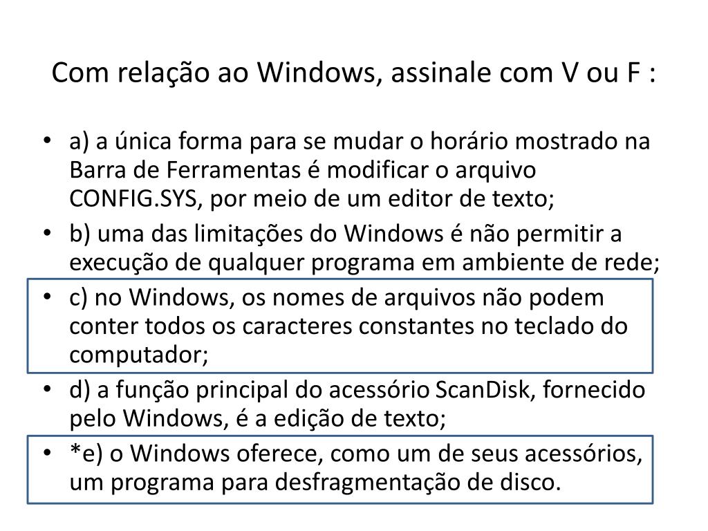 Com relação ao Windows, assinale com V ou F : • a) a única forma para se mudar o horário mostrado na Barra de Ferramentas é modificar o arquivo CONFIG.SYS, por meio de um editor de texto; • b) uma das limitações do Windows é não permitir a execução de qualquer programa em ambiente de rede; • c) no Windows, os nomes de arquivos não podem conter todos os caracteres constantes no teclado do computador; • d) a função principal do acessório ScanDisk, fornecido pelo Windows, é a edição de texto; • *e) o Windows oferece, como um de seus acessórios, um programa para desfragmentação de disco.