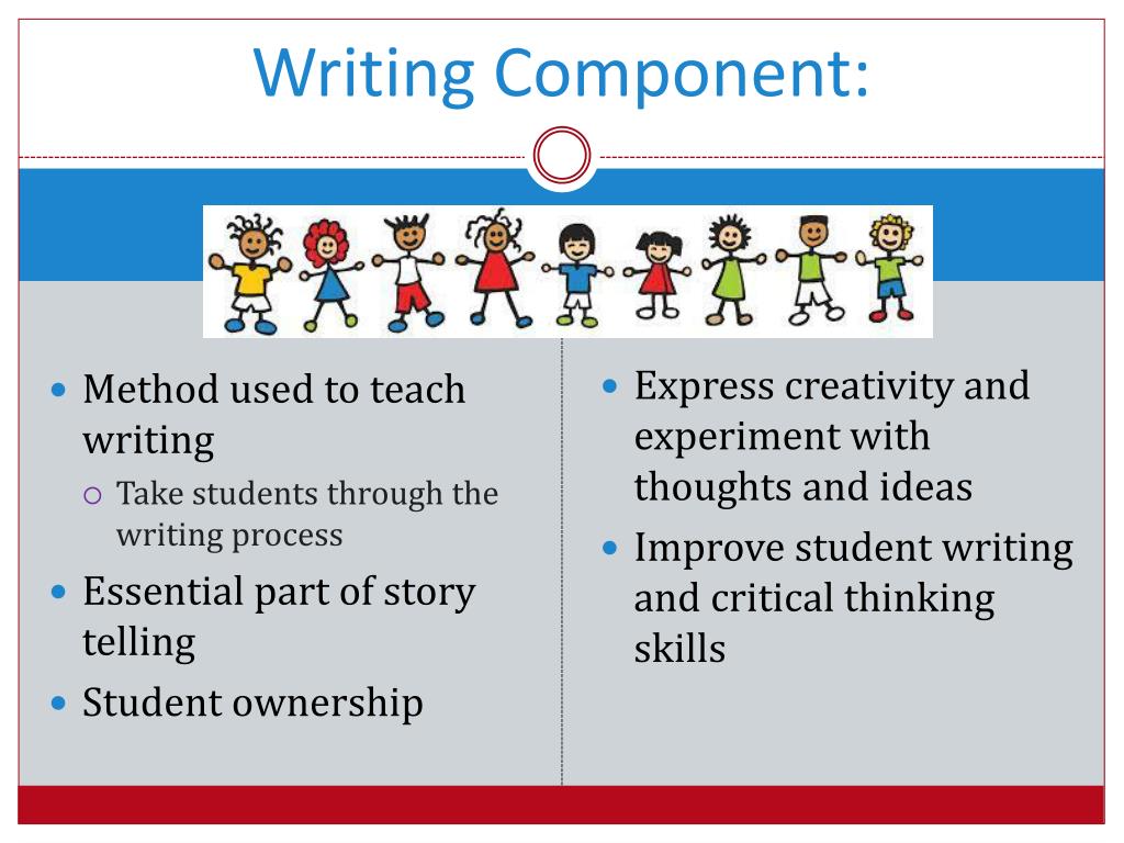 Writing Component: • Express creativity and experiment with thoughts and ideas • Improve student writing and critical thinking skills • Method used to teach writing • Take students through the writing process • Essential part of story telling • Student ownership