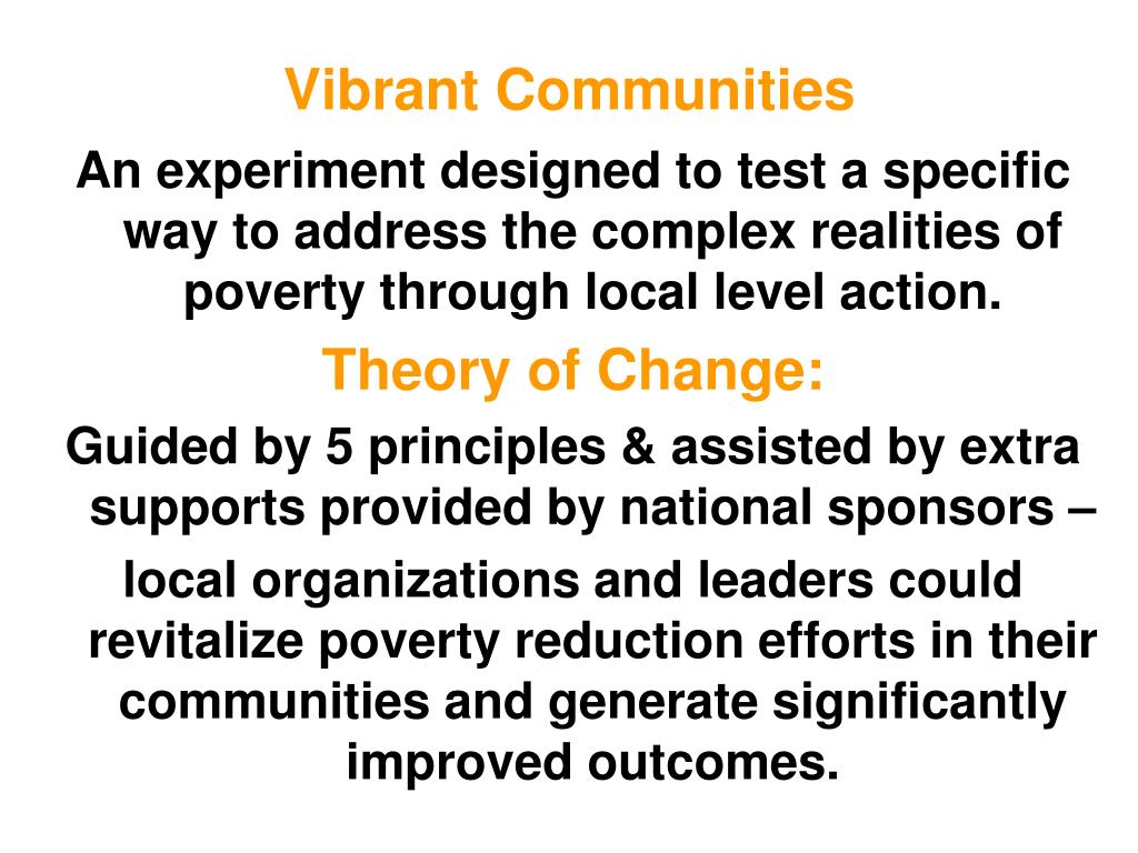 Vibrant Communities An experiment designed to test a specific way to address the complex realities of poverty through local level action. Theory of Change: Guided by 5 principles & assisted by extra supports provided by national sponsors – local organizations and leaders could revitalize poverty reduction efforts in their communities and generate significantly improved outcomes.
