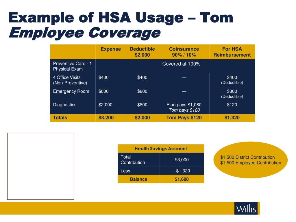 Example of HSA Usage – TomEmployee Coverage $1,500 District Contribution $1,500 Employee Contribution