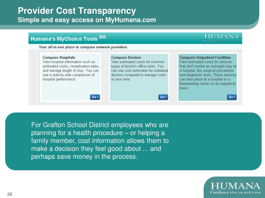 Provider Cost TransparencySimple and easy access on MyHumana.com For Grafton School District employees who are planning for a health procedure – or helping a family member, cost information allows them to make a decision they feel good about ... and perhaps save money in the process.