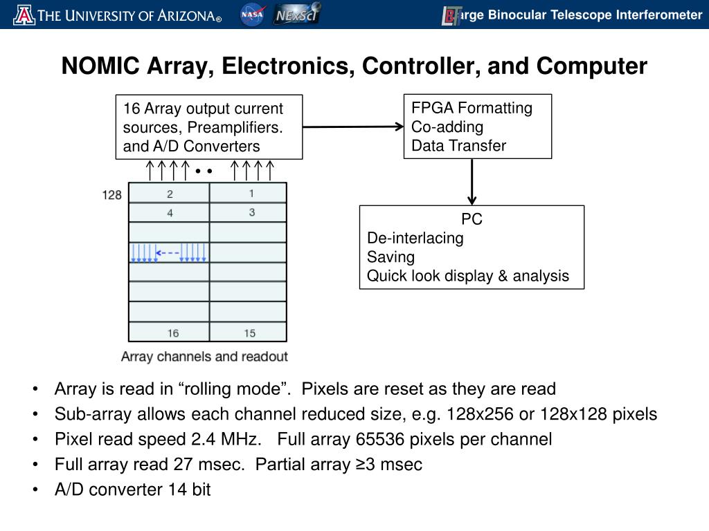 NOMIC Array, Electronics, Controller, and Computer FPGA Formatting Co-adding Data Transfer 16 Array output current sources, Preamplifiers. and A/D Converters PC De-interlacing Saving Quick look display & analysis • Array is read in “rolling mode”. Pixels are reset as they are read • Sub-array allows each channel reduced size, e.g. 128x256 or 128x128 pixels • Pixel read speed 2.4 MHz. Full array 65536 pixels per channel • Full array read 27 msec. Partial array ≥3 msec • A/D converter 14 bit