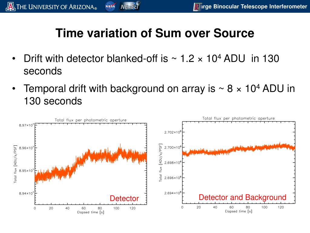 Time variation of Sum over Source • Drift with detector blanked-off is ~ 1.2 × 104 ADU in 130 seconds • Temporal drift with background on array is ~ 8 × 104 ADU in 130 seconds Detector and Background Detector