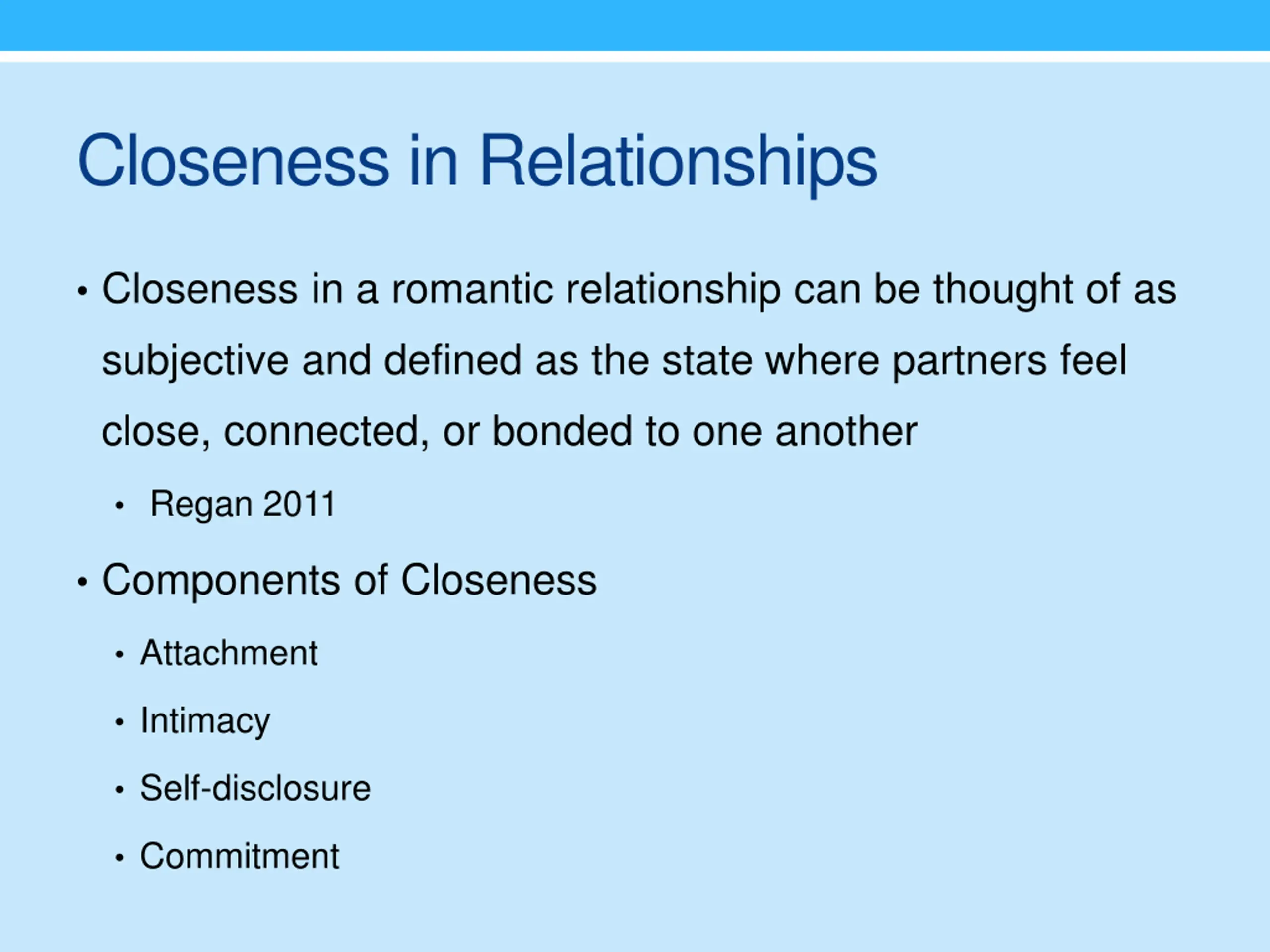 Closeness in Relationships • Closeness in a romantic relationship can be thought of as subjective and defined as the state where partners feel close, connected, or bonded to one another • Regan 2011 • Components of Closeness • Attachment • Intimacy • Self-disclosure • Commitment