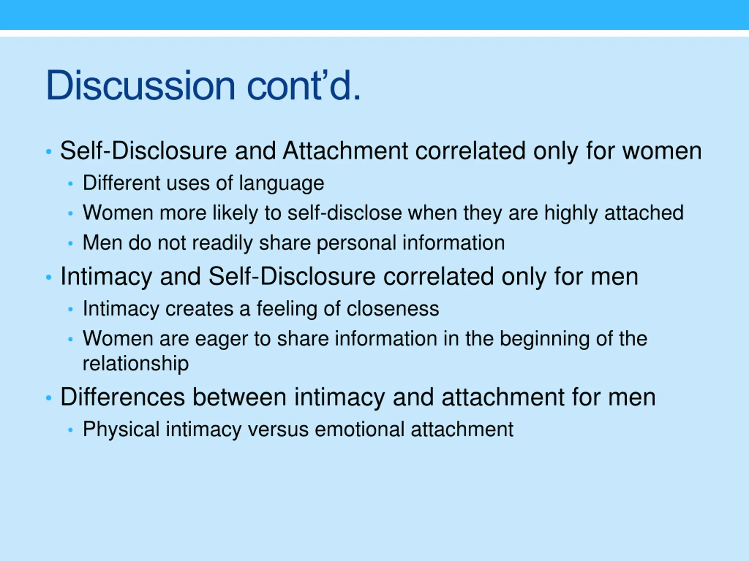 Discussion cont’d. • Self-Disclosure and Attachment correlated only for women • Different uses of language • Women more likely to self-disclose when they are highly attached • Men do not readily share personal information • Intimacy and Self-Disclosure correlated only for men • Intimacy creates a feeling of closeness • Women are eager to share information in the beginning of the relationship • Differences between intimacy and attachment for men • Physical intimacy versus emotional attachment