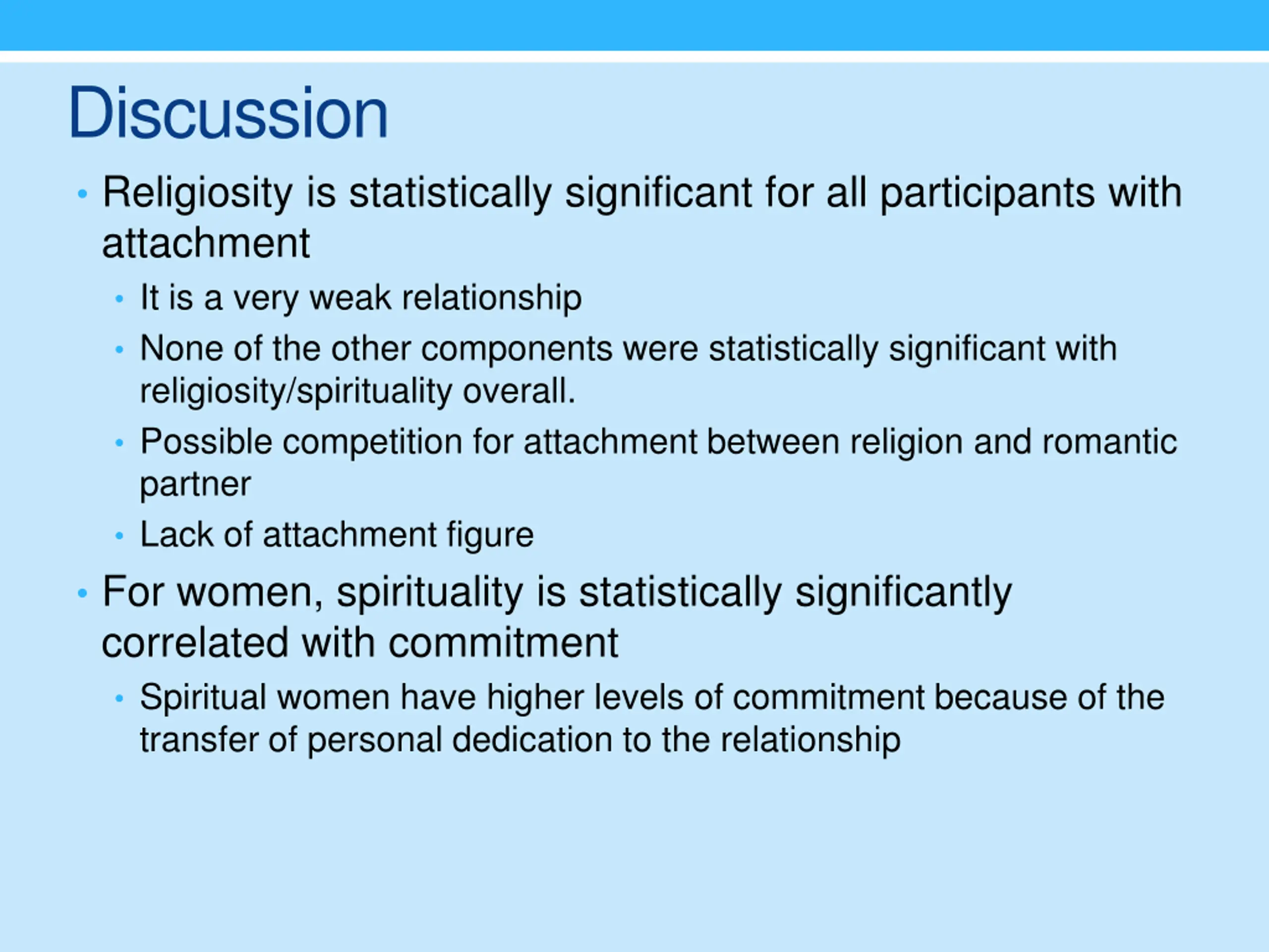Discussion • Religiosity is statistically significant for all participants with attachment • It is a very weak relationship • None of the other components were statistically significant with religiosity/spirituality overall. • Possible competition for attachment between religion and romantic partner • Lack of attachment figure • For women, spirituality is statistically significantly correlated with commitment • Spiritual women have higher levels of commitment because of the transfer of personal dedication to the relationship