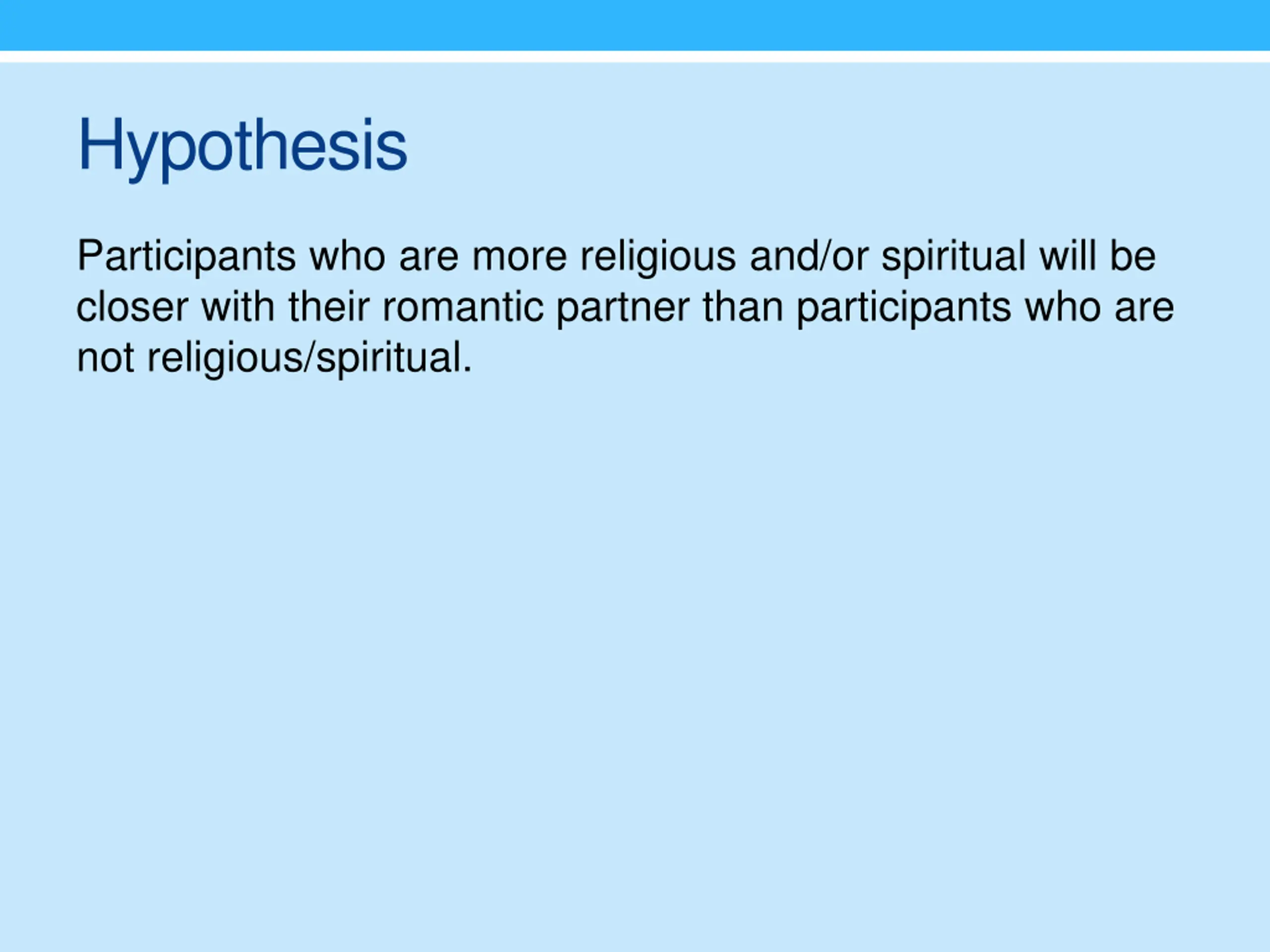 Hypothesis Participants who are more religious and/or spiritual will be closer with their romantic partner than participants who are not religious/spiritual.