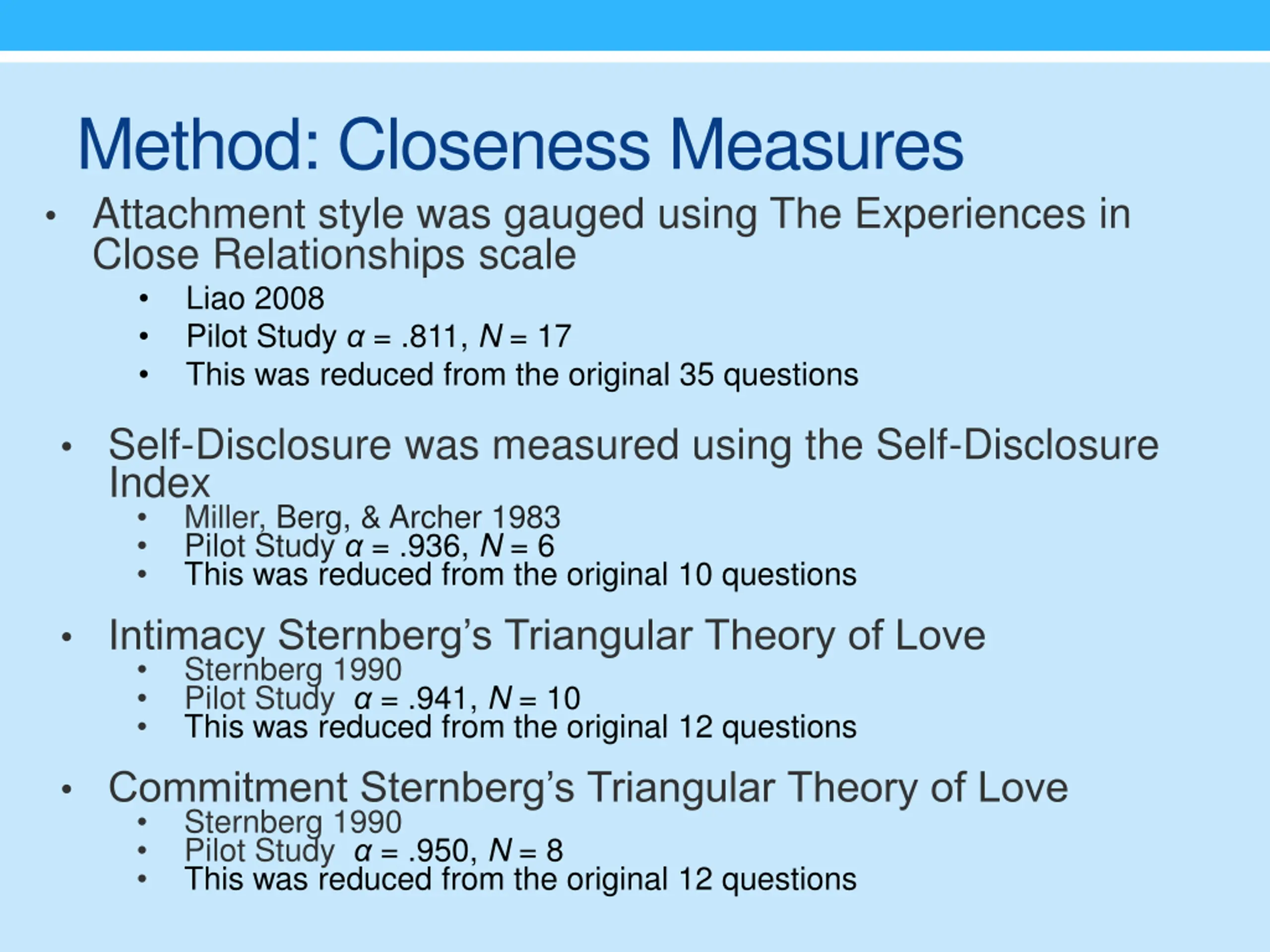 Method: Closeness Measures • Attachment style was gauged using The Experiences in Close Relationships scale • Liao 2008 • Pilot Study α = .811, N = 17 • This was reduced from the original 35 questions • Self-Disclosure was measured using the Self-Disclosure Index • Miller, Berg, & Archer 1983 • Pilot Study α = .936, N = 6 • This was reduced from the original 10 questions • Intimacy Sternberg’s Triangular Theory of Love • Sternberg 1990 • Pilot Study α = .941, N = 10 • This was reduced from the original 12 questions • Commitment Sternberg’s Triangular Theory of Love • Sternberg 1990 • Pilot Study α = .950, N = 8 • This was reduced from the original 12 questions