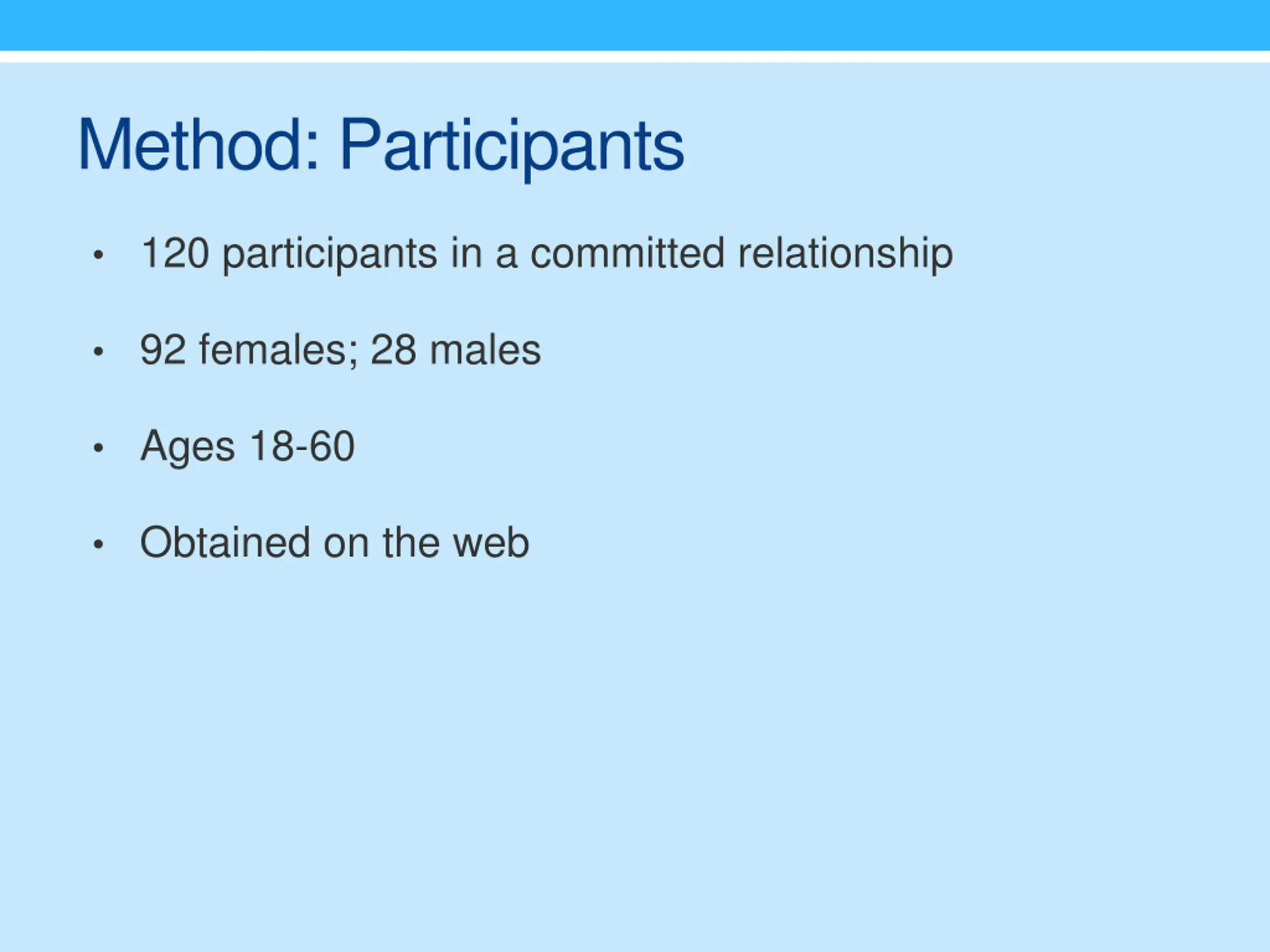 Method: Participants • 120 participants in a committed relationship • 92 females; 28 males • Ages 18-60 • Obtained on the web