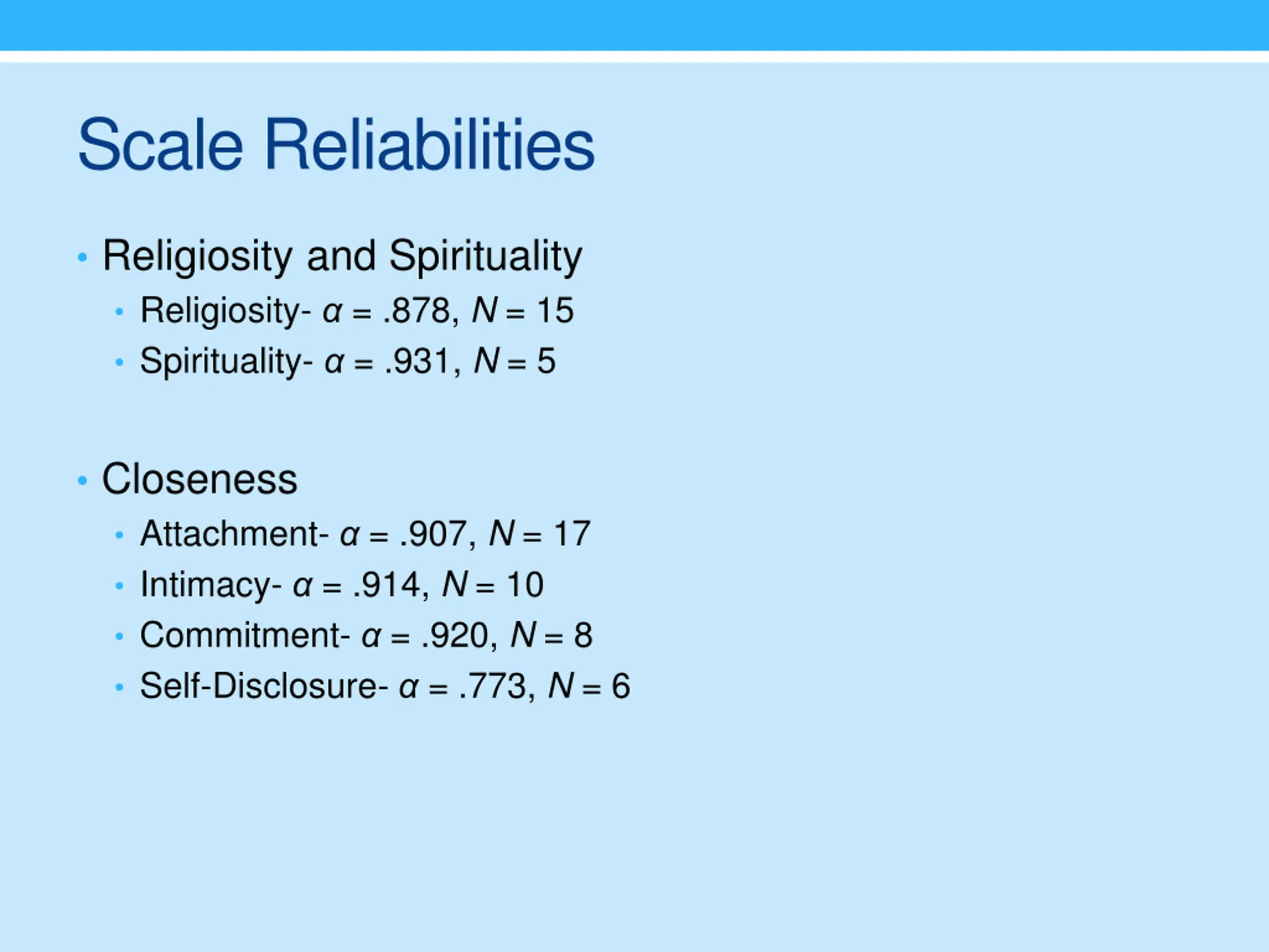 Scale Reliabilities • Religiosity and Spirituality • Religiosity- α = .878, N = 15 • Spirituality- α = .931, N = 5 • Closeness • Attachment- α = .907, N = 17 • Intimacy- α = .914, N = 10 • Commitment- α = .920, N = 8 • Self-Disclosure- α = .773, N = 6