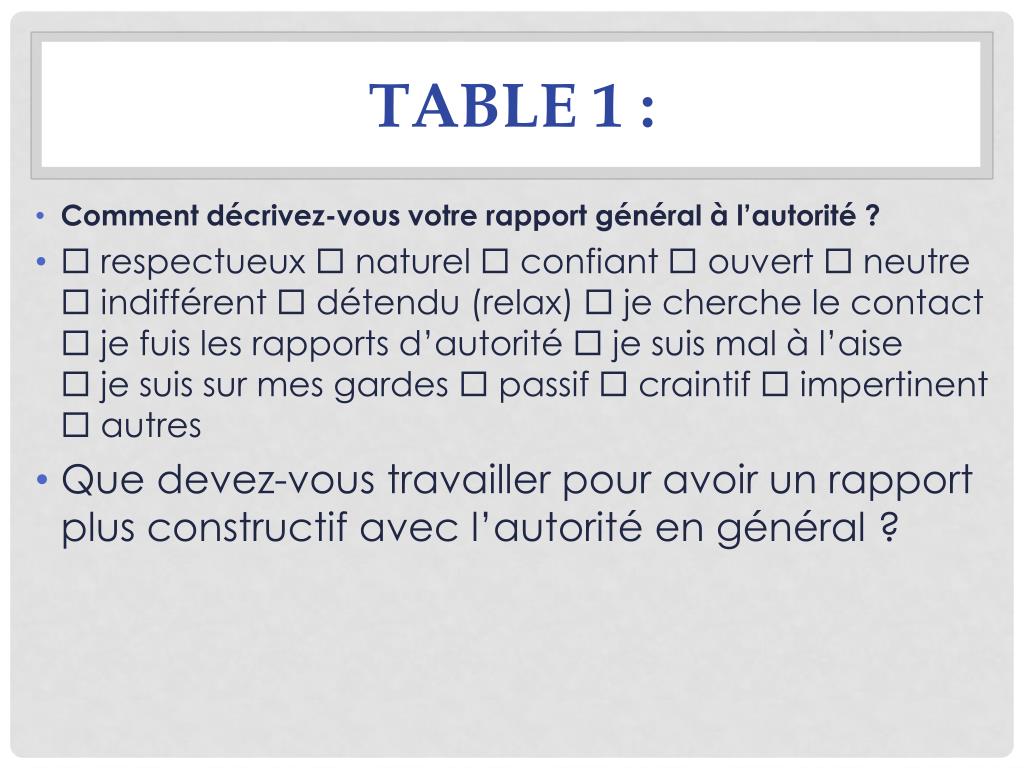 TABLE 1 : • Comment décrivez-vous votre rapport général à l’autorité ? • respectueux naturel confiant ouvert neutre indifférent détendu (relax) je cherche le contact je fuis les rapports d’autorité je suis mal à l’aise je suis sur mes gardes passif craintif impertinent autres • Que devez-vous travailler pour avoir un rapport plus constructif avec l’autorité en général ?