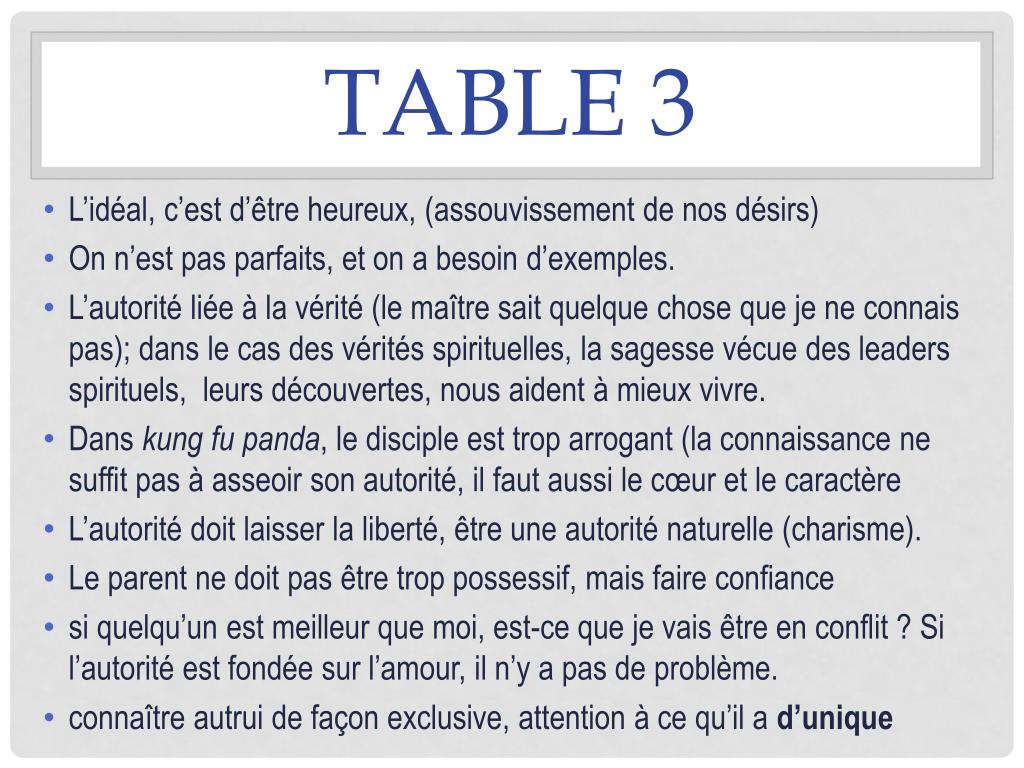Table 3 • L’idéal, c’est d’être heureux, (assouvissement de nos désirs) • On n’est pas parfaits, et on a besoin d’exemples. • L’autorité liée à la vérité (le maître sait quelque chose que je ne connais pas); dans le cas des vérités spirituelles, la sagesse vécue des leaders spirituels, leurs découvertes, nous aident à mieux vivre. • Dans kung fu panda, le disciple est trop arrogant (la connaissance ne suffit pas à asseoir son autorité, il faut aussi le cœur et le caractère • L’autorité doit laisser la liberté, être une autorité naturelle (charisme). • Le parent ne doit pas être trop possessif, mais faire confiance • si quelqu’un est meilleur que moi, est-ce que je vais être en conflit ? Si l’autorité est fondée sur l’amour, il n’y a pas de problème. • connaître autrui de façon exclusive, attention à ce qu’il a d’unique