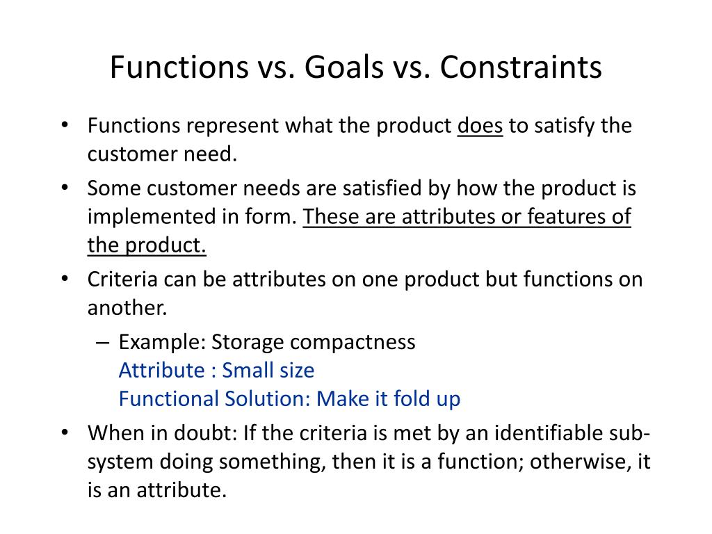 Functions vs. Goals vs. Constraints • Functions represent what the product does to satisfy the customer need. • Some customer needs are satisfied by how the product is implemented in form. These are attributes or features of the product. • Criteria can be attributes on one product but functions on another. • Example: Storage compactnessAttribute : Small sizeFunctional Solution: Make it fold up • When in doubt: If the criteria is met by an identifiable sub-system doing something, then it is a function; otherwise, it is an attribute.