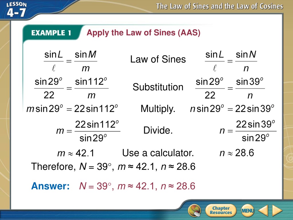 Law of Sines Substitution Multiply. Divide. Use a calculator. Apply the Law of Sines (AAS) Therefore, N = 39°, m ≈ 42.1, n ≈ 28.6 Answer:N = 39°, m ≈ 42.1, n ≈ 28.6 Example 1