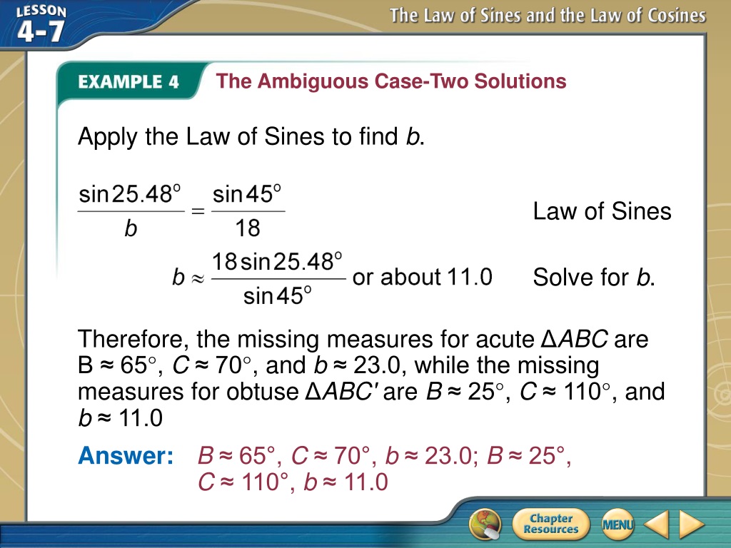 Law of Sines Solve for b. The Ambiguous Case-Two Solutions Apply the Law of Sines to find b. Therefore, the missing measures for acute ΔABC are B ≈ 65°, C ≈ 70°, and b ≈ 23.0, while the missing measures for obtuse ΔABC' are B ≈ 25°, C ≈ 110°, and b ≈ 11.0 Answer:B≈ 65°, C ≈ 70°, b ≈ 23.0; B≈ 25°, C ≈ 110°, b ≈ 11.0 Example 4