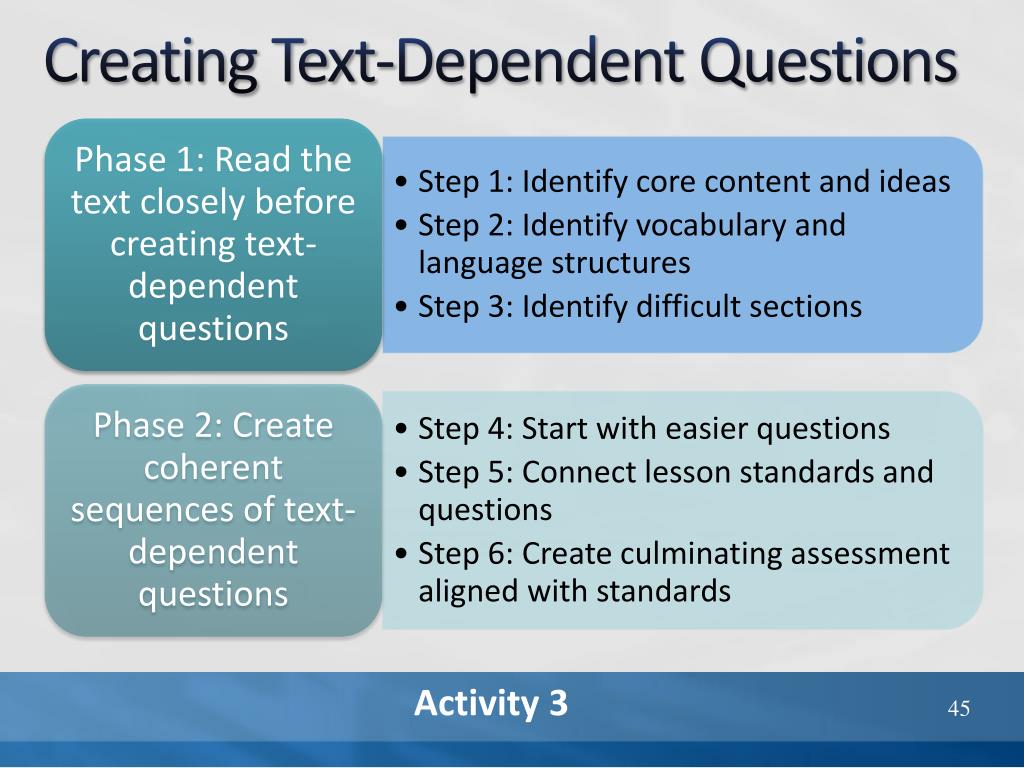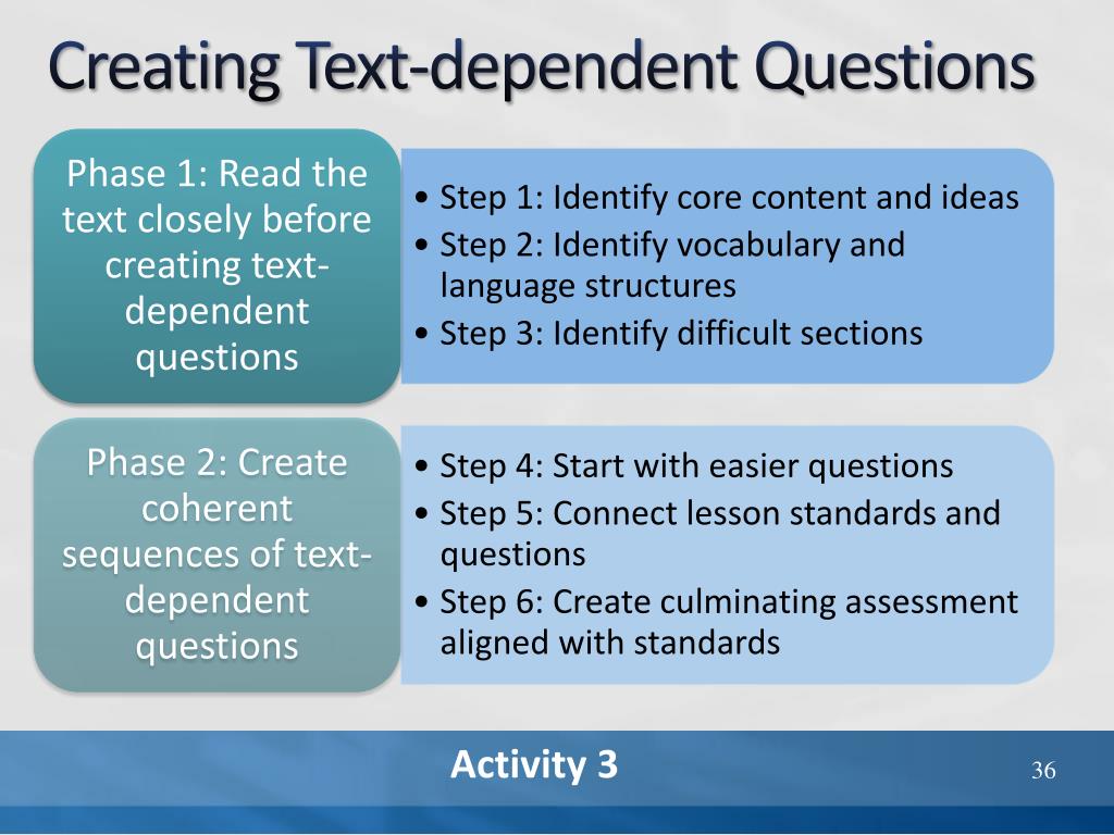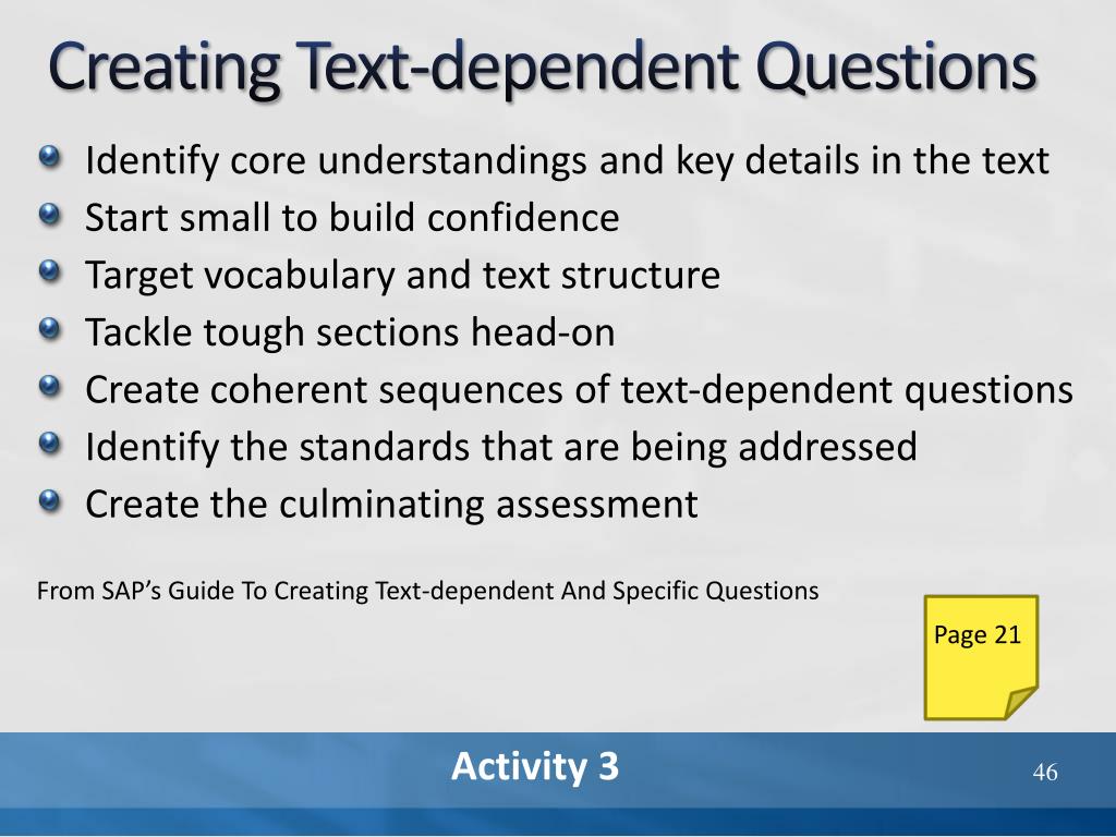 Creating Text-dependent Questions • Identify core understandings and key details in the text • Start small to build confidence • Target vocabulary and text structure • Tackle tough sections head-on • Create coherent sequences of text-dependent questions • Identify the standards that are being addressed • Create the culminating assessment From SAP’s Guide To Creating Text-dependent And Specific Questions Page 21