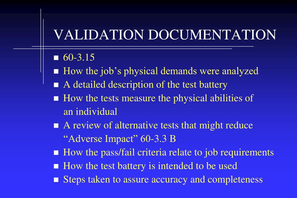 VALIDATION DOCUMENTATION • 60-3.15 • How the job’s physical demands were analyzed • A detailed description of the test battery • How the tests measure the physical abilities of an individual • A review of alternative tests that might reduce “Adverse Impact” 60-3.3 B • How the pass/fail criteria relate to job requirements • How the test battery is intended to be used • Steps taken to assure accuracy and completeness