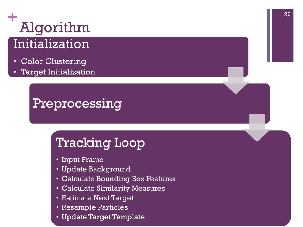 Algorithm • Initialization • Color Clustering • Target Initialization • Preprocessing • Tracking Loop • Input Frame • Update Background • Calculate Bounding Box Features • Calculate Similarity Measures • Estimate Next Target • Resample Particles • Update Target Template