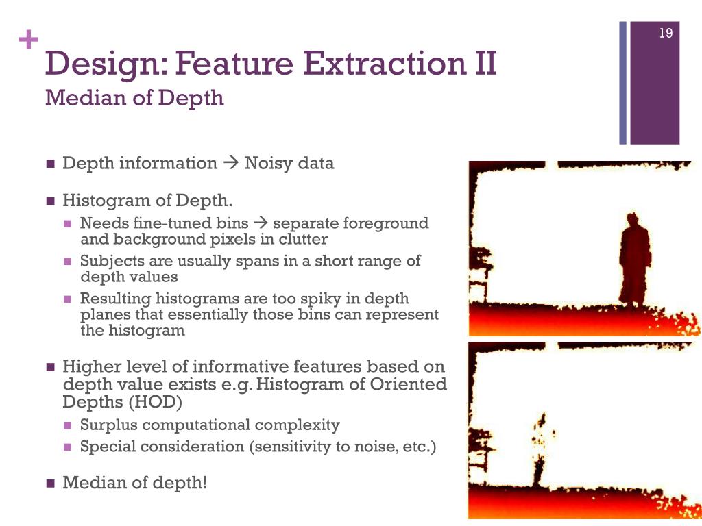 Design: Feature Extraction IIMedian of Depth • Depth information Noisy data • Histogram of Depth. • Needs fine-tuned bins separate foreground and background pixels in clutter • Subjects are usually spans in a short range of depth values • Resulting histograms are too spiky in depth planes that essentially those bins can represent the histogram • Higher level of informative features based on depth value exists e.g. Histogram of Oriented Depths (HOD) • Surplus computational complexity • Special consideration (sensitivity to noise, etc.) • Median of depth!