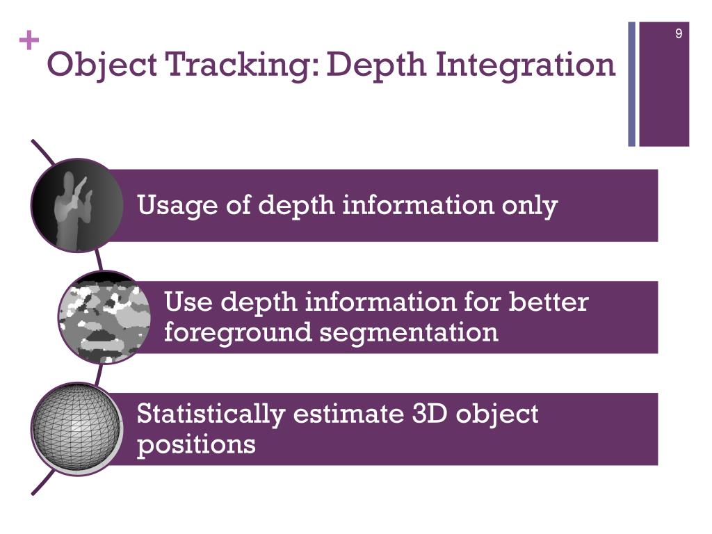 Target Model • Initialization • Manually • Automatically with known color hist. • Object detection algorithm • Expectation of Target • Statistical expectation of all particles • Target Update • Smooth transition between video frames • By discarding image outlier • Forgetting process • Same for updating depth • Occlusion Handling • Updating a model under partial or full occluded model losing proper template gradually for next slides