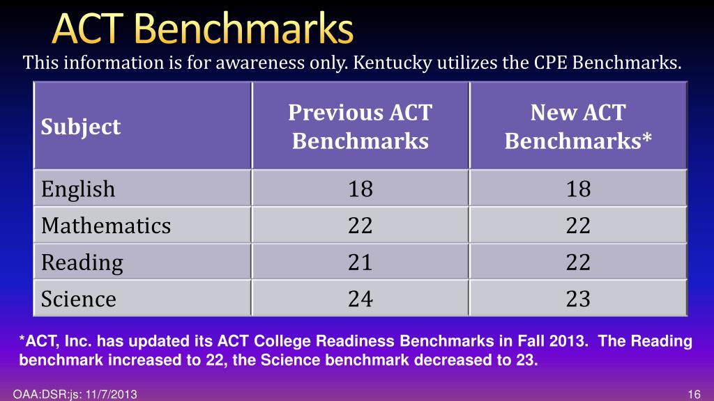 ACT Benchmarks This information is for awareness only. Kentucky utilizes the CPE Benchmarks. *ACT, Inc. has updated its ACT College Readiness Benchmarks in Fall 2013. The Reading benchmark increased to 22, the Science benchmark decreased to 23.
