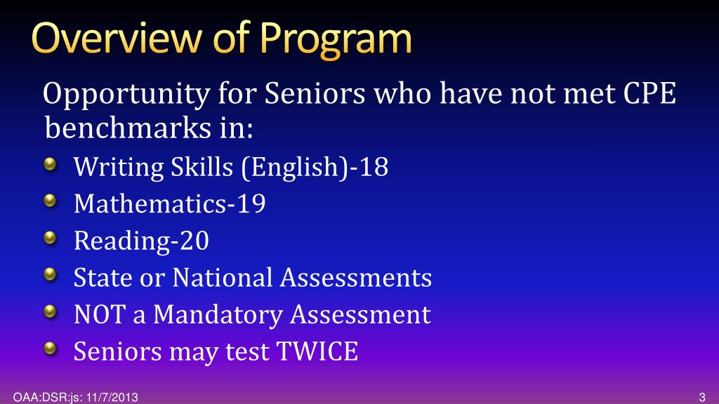 Overview of Program Opportunity for Seniors who have not met CPE benchmarks in: • Writing Skills (English)-18 • Mathematics-19 • Reading-20 • State or National Assessments • NOT a Mandatory Assessment • Seniors may test TWICE