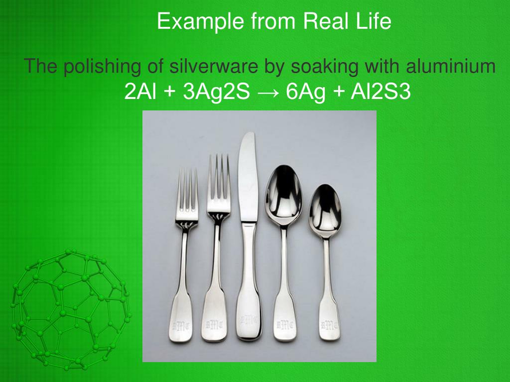 Example from Real Life The polishing of silverware by soaking with aluminium 2Al + 3Ag2S → 6Ag + Al2S3