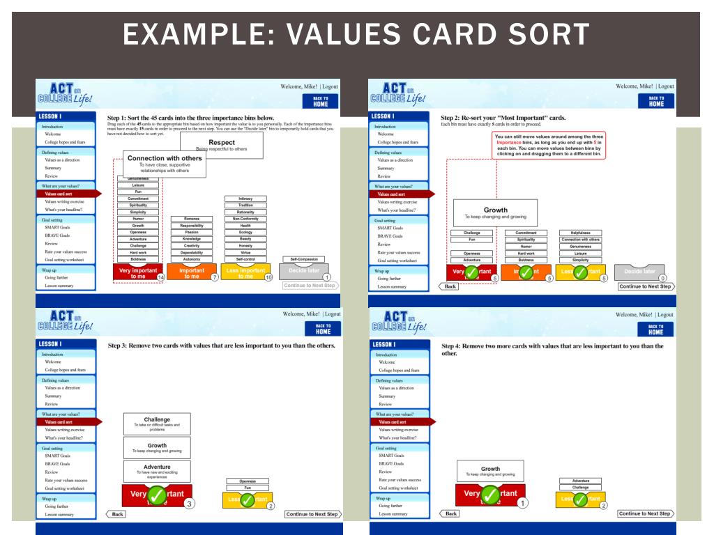 Disclosure • The ACT on College Life project is supported by a Small Business Innovation Research grant awarded to Contextual Change LLC • National Institute of Mental Health - R43 MH085336 • Intended to eventually lead to a commercial product