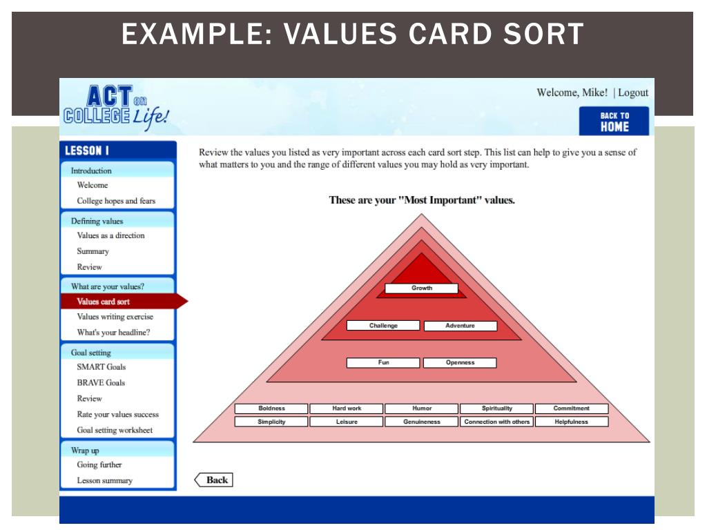 ACT-CL Lesson Content • Lesson 1: Exploring your values • Defining what values are • Clarifying and reflecting on personal values • Defining effective and values-based goals • Goal setting • Lesson 2: Dealing with barriers • Exploring internal barriers to values-based action • The problem with control strategies • Defining and practicing willingness • Linking willingness to values-based action