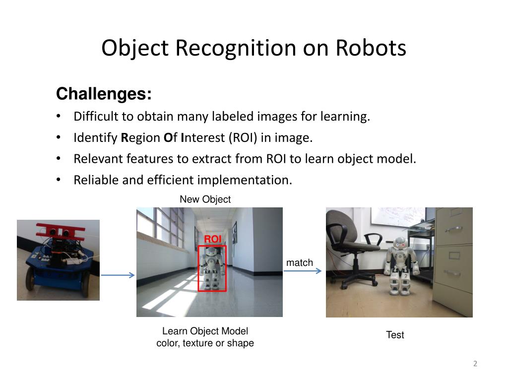 Object Recognition on Robots • Challenges: • Difficult to obtain many labeled images for learning. • Identify Region Of Interest (ROI) in image. • Relevant features to extract from ROI to learn object model. • Reliable and efficient implementation. New Object ROI match Learn Object Model color, texture or shape Test