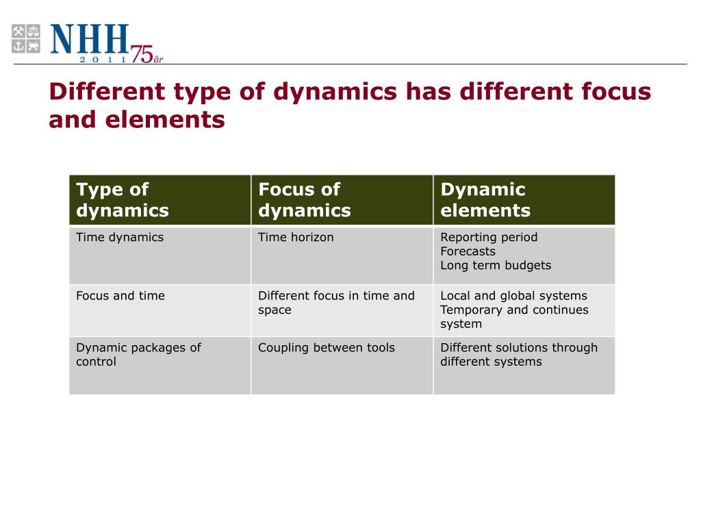 Dynamics in management control To understand dynamics is to understand why things are moving, and why there is change in this movement. ---- • Dynamics in time • Dynamics in focus • Dynamics in construction of control packages