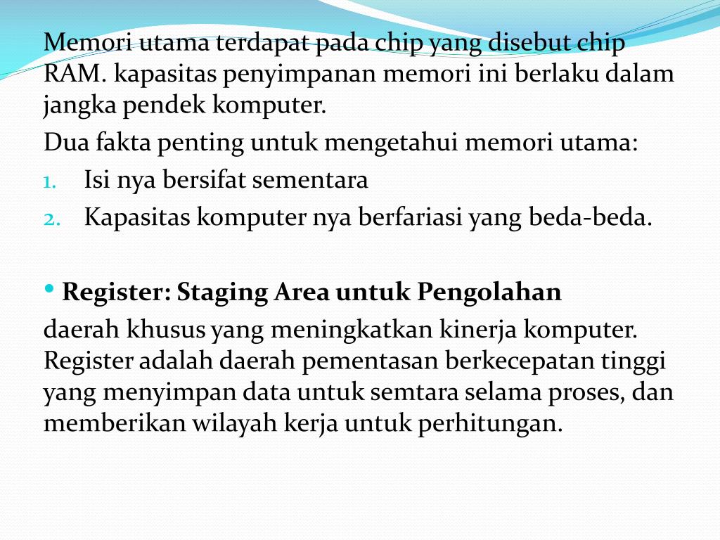 Memori utama terdapat pada chip yang disebut chip RAM. kapasitas penyimpanan memori ini berlaku dalam jangka pendek komputer. Dua fakta penting untuk mengetahui memori utama: • Isi nya bersifat sementara • Kapasitas komputer nya berfariasi yang beda-beda. • Register: Staging Area untuk Pengolahan daerah khusus yang meningkatkan kinerja komputer. Register adalah daerah pementasan berkecepatan tinggi yang menyimpan data untuk semtara selama proses, dan memberikan wilayah kerja untuk perhitungan.