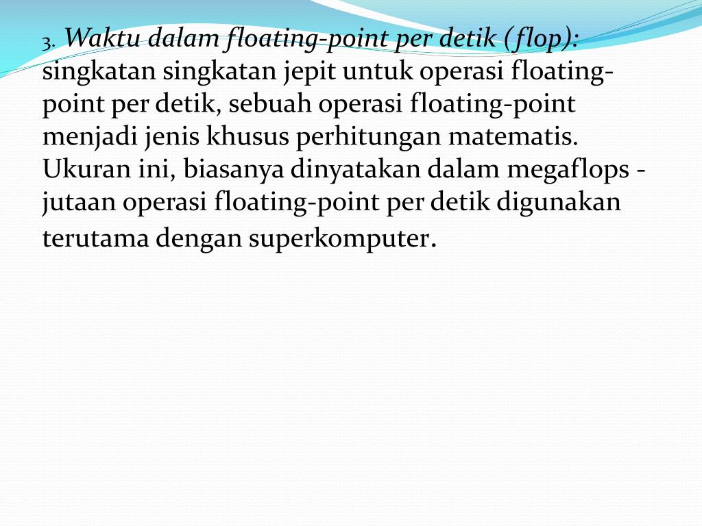3.Waktu dalam floating-point per detik (flop): singkatan singkatan jepit untuk operasi floating-point per detik, sebuah operasi floating-point menjadi jenis khusus perhitungan matematis. Ukuran ini, biasanya dinyatakan dalam megaflops - jutaan operasi floating-point per detik digunakan terutama dengan superkomputer.