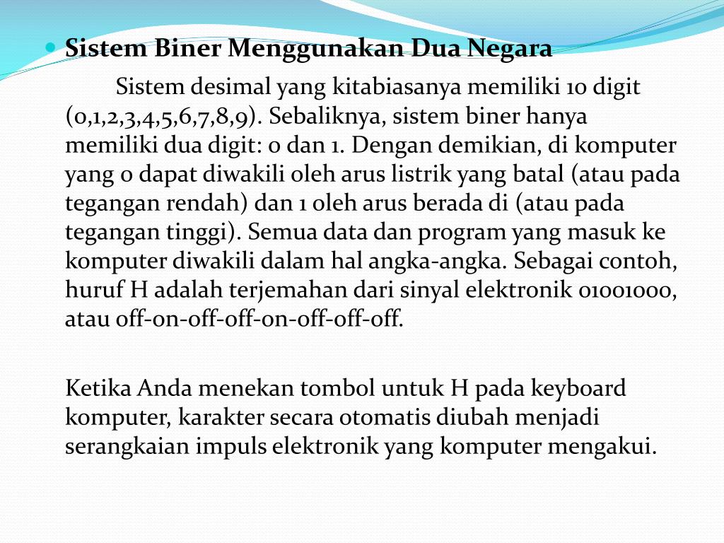 Sistem Biner Menggunakan Dua Negara Sistem desimal yang kitabiasanya memiliki 10 digit (0,1,2,3,4,5,6,7,8,9). Sebaliknya, sistem biner hanya memiliki dua digit: 0 dan 1. Dengan demikian, di komputer yang 0 dapat diwakili oleh arus listrik yang batal (atau pada tegangan rendah) dan 1 oleh arus berada di (atau pada tegangan tinggi). Semua data dan program yang masuk ke komputer diwakili dalam hal angka-angka. Sebagai contoh, huruf H adalah terjemahan dari sinyal elektronik 01001000, atau off-on-off-off-on-off-off-off. Ketika Anda menekan tombol untuk H pada keyboard komputer, karakter secara otomatis diubah menjadi serangkaian impuls elektronik yang komputer mengakui.
