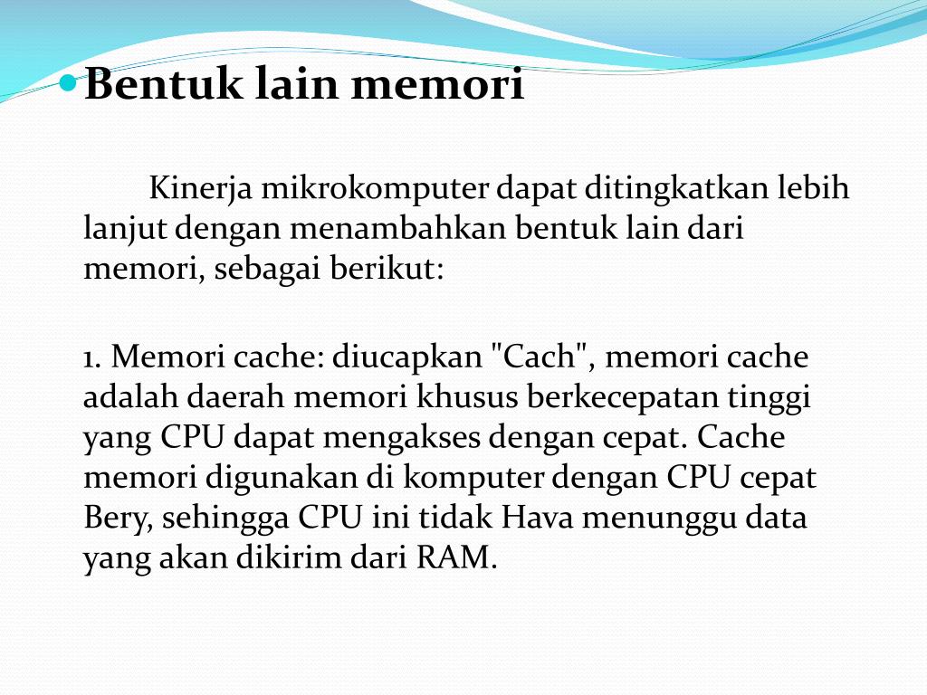 Bentuk lain memori Kinerja mikrokomputer dapat ditingkatkan lebih lanjut dengan menambahkan bentuk lain dari memori, sebagai berikut: 1. Memori cache: diucapkan "Cach", memori cache adalah daerah memori khusus berkecepatan tinggi yang CPU dapat mengakses dengan cepat. Cache memori digunakan di komputer dengan CPU cepat Bery, sehingga CPU ini tidak Hava menunggu data yang akan dikirim dari RAM.