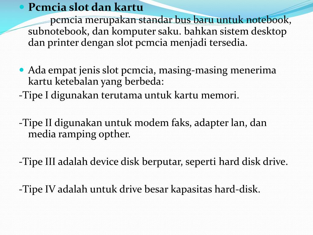 Pcmcia slot dan kartupcmcia merupakan standar bus baru untuk notebook, subnotebook, dan komputer saku. bahkan sistem desktop dan printer dengan slot pcmcia menjadi tersedia. • Ada empat jenis slot pcmcia, masing-masing menerima kartu ketebalan yang berbeda: -Tipe I digunakan terutama untuk kartu memori. -Tipe II digunakan untuk modem faks, adapter lan, dan media ramping opther. -Tipe III adalah device disk berputar, seperti hard disk drive. -Tipe IV adalah untuk drive besar kapasitas hard-disk.