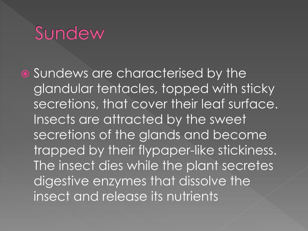 Sundew • Sundews are characterised by the glandular tentacles, topped with sticky secretions, that cover their leaf surface. Insects are attracted by the sweet secretions of the glands and become trapped by their flypaper-like stickiness. The insect dies while the plant secretes digestive enzymes that dissolve the insect and release its nutrients