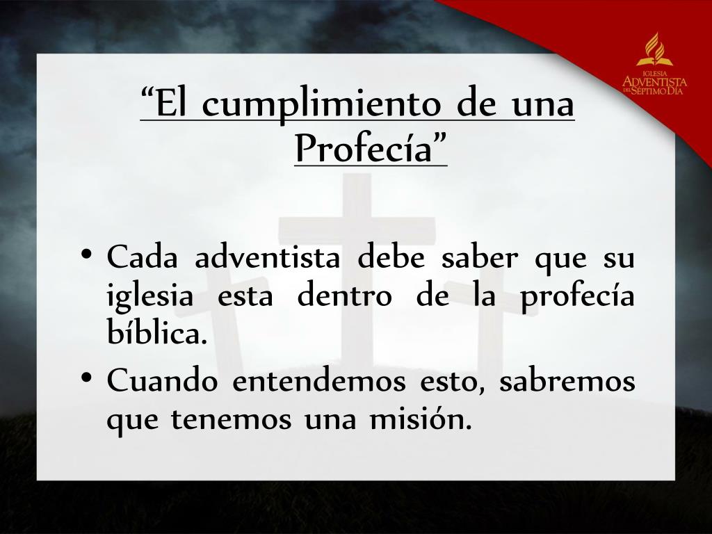 “El cumplimiento de una Profecía” • Cada adventista debe saber que su iglesia esta dentro de la profecía bíblica. • Cuando entendemos esto, sabremos que tenemos una misión.