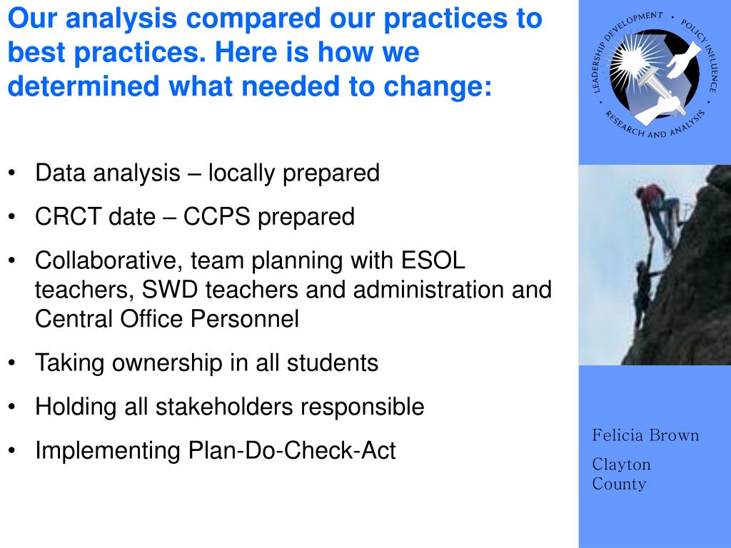 Our analysis compared our practices to best practices. Here is how we determined what needed to change: • Data analysis – locally prepared • CRCT date – CCPS prepared • Collaborative, team planning with ESOL teachers, SWD teachers and administration and Central Office Personnel • Taking ownership in all students • Holding all stakeholders responsible • Implementing Plan-Do-Check-Act
