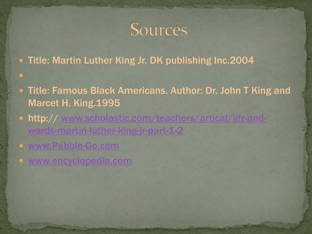 Sources • Title: Martin Luther King Jr. DK publishing Inc.2004 • Title: Famous Black Americans. Author: Dr. John T King and Marcet H. King.1995 • http:// www.scholastic.com/teachers/artical/lifr-and-words-martin-luther-king-jr-part-1-2 • www.Pebble-Go.com • www.encyclopedia.com