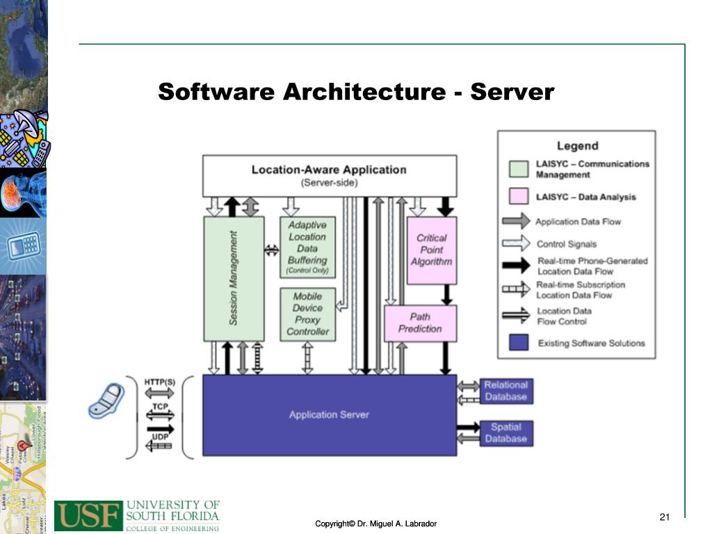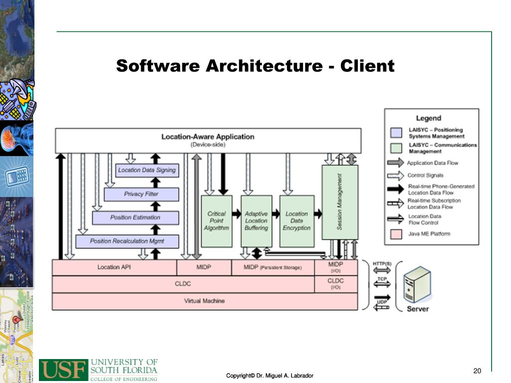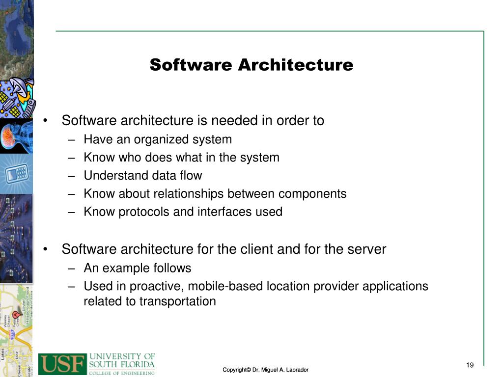 Software Architecture • Software architecture is needed in order to • Have an organized system • Know who does what in the system • Understand data flow • Know about relationships between components • Know protocols and interfaces used • Software architecture for the client and for the server • An example follows • Used in proactive, mobile-based location provider applications related to transportation
