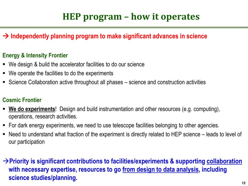 HEP program – strengths & model DOE Office of Science: Provide science leadership and support to enable significant advances in science areas. Model to enable the work: • Lab environment with a variety of resources needed • Job is to build and operate facilities to do research; develop new projects – all phases • Lab infrastructure, including computing facilities (NERSC, SCiDAC program etc) • Long term support for participation in all phases • Encourage collaborations with expertise in required areas to make significant advances • Partnerships as needed to leverage additional science and expertise • Include speculative science (e.g. led to dark energy discovery) DOE model has been very successful: See http://science.energy.gov/about/honors-and-awards/doe-nobel-laureates/ 11