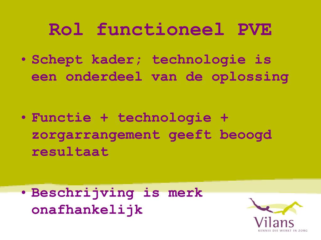 Rol functioneel PVE Schept kader; technologie is een onderdeel van de oplossing Functie + technologie + zorgarrangement geeft beoogd resultaat Beschrijving is merk onafhankelijk