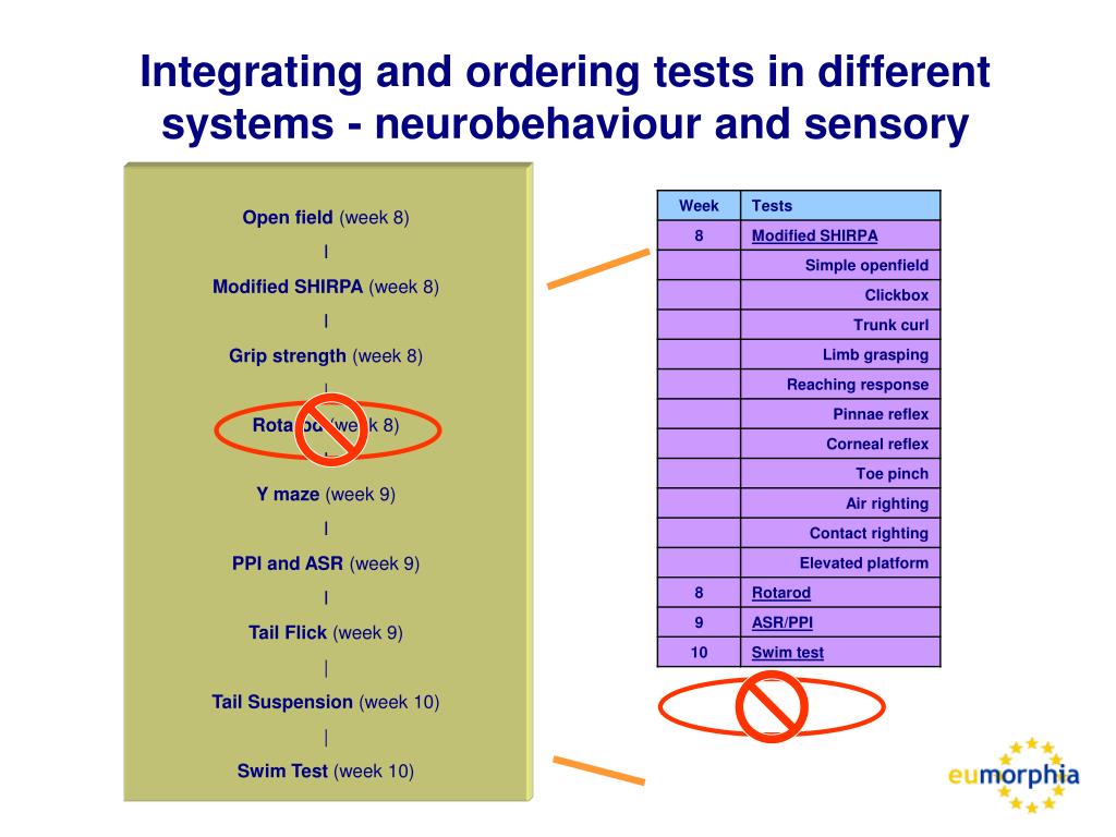 Integrating and ordering tests in different systems - neurobehaviour and sensory Open field (week 8) I Modified SHIRPA (week 8) I Grip strength (week 8) | Rotarod (week 8) I Y maze (week 9) I PPI and ASR (week 9) I Tail Flick (week 9) | Tail Suspension (week 10) | Swim Test (week 10)