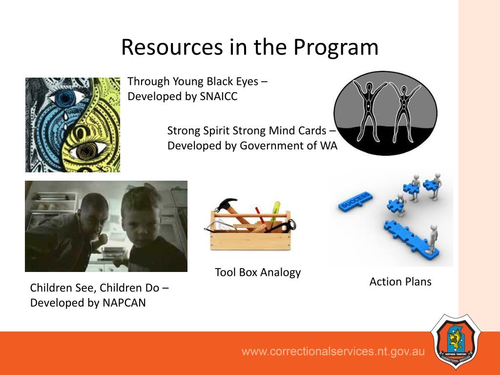 Resources in the Program Through Young Black Eyes – Developed by SNAICC Strong Spirit Strong Mind Cards – Developed by Government of WA Tool Box Analogy Action Plans Children See, Children Do – Developed by NAPCAN
