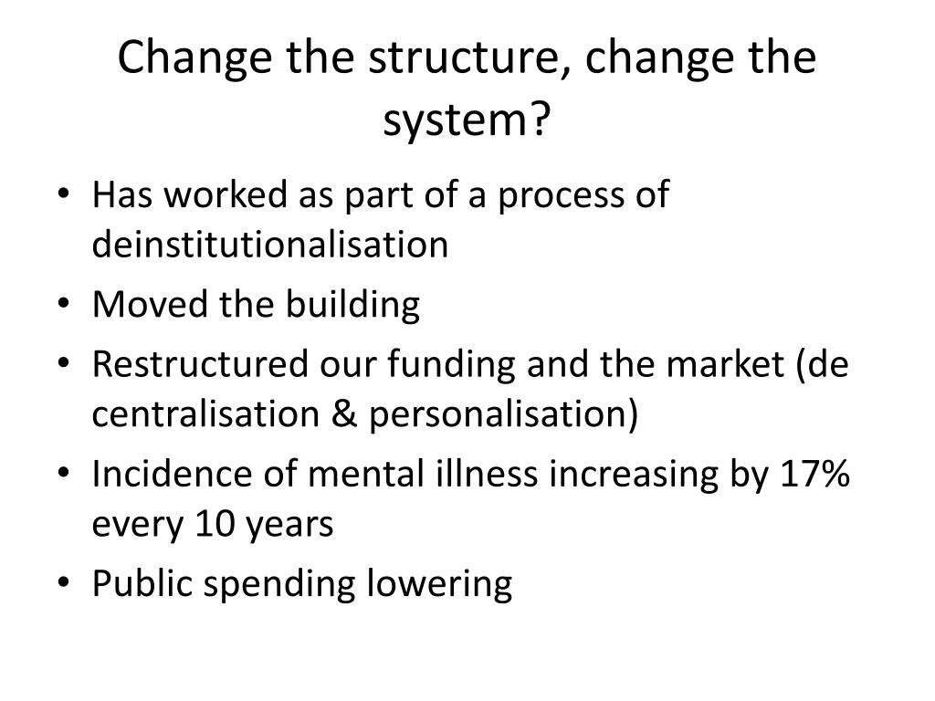 Change the structure, change the system? • Has worked as part of a process of deinstitutionalisation • Moved the building • Restructured our funding and the market (de centralisation & personalisation) • Incidence of mental illness increasing by 17% every 10 years • Public spending lowering