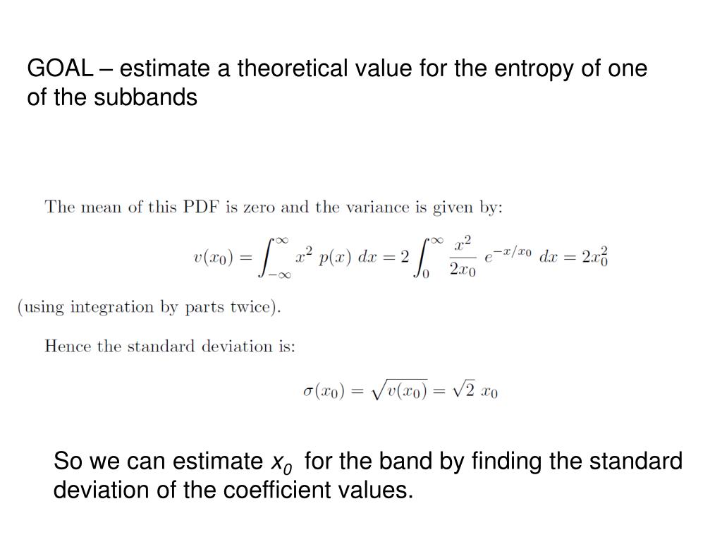 GOAL – estimate a theoretical value for the entropy of one of the subbands So we can estimate x0 for the band by finding the standard deviation of the coefficient values.