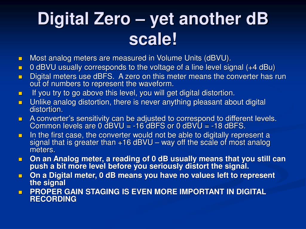 Digital Zero – yet another dB scale! • Most analog meters are measured in Volume Units (dBVU). • 0 dBVU usually corresponds to the voltage of a line level signal (+4 dBu) • Digital meters use dBFS. A zero on this meter means the converter has run out of numbers to represent the waveform. • If you try to go above this level, you will get digital distortion. • Unlike analog distortion, there is never anything pleasant about digital distortion. • A converter’s sensitivity can be adjusted to correspond to different levels. Common levels are 0 dBVU = -16 dBFS or 0 dBVU = -18 dBFS. • In the first case, the converter would not be able to digitally represent a signal that is greater than +16 dBVU – way off the scale of most analog meters. • On an Analog meter, a reading of 0 dB usually means that you still can push a bit more level before you seriously distort the signal. • On a Digital meter, 0 dB means you have no values left to represent the signal • PROPER GAIN STAGING IS EVEN MORE IMPORTANT IN DIGITAL RECORDING