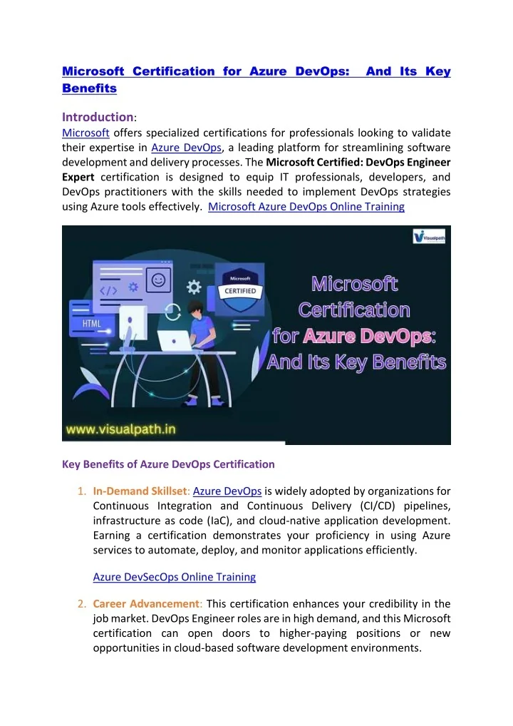 Microsoft Certification for Azure DevOps: And Its Key Benefits Introduction: Microsoft offers specialized certifications for professionals looking to validate their expertise in Azure DevOps, a leading platform for streamlining software development and delivery processes. The Microsoft Certified: DevOps Engineer Expert certification is designed to equip IT professionals, developers, and DevOps practitioners with the skills needed to implement DevOps strategies using Azure tools effectively. Microsoft Azure DevOps Online Training Key Benefits of Azure DevOps Certification 1.In-Demand Skillset: Azure DevOps is widely adopted by organizations for Continuous Integration and Continuous Delivery (CI/CD) pipelines, infrastructure as code (IaC), and cloud-native application development. Earning a certification demonstrates your proficiency in using Azure services to automate, deploy, and monitor applications efficiently. Azure DevSecOps Online Training 2.Career Advancement: This certification enhances your credibility in the job market. DevOps Engineer roles are in high demand, and this Microsoft certification can open doors to higher-paying positions or new opportunities in cloud-based software development environments.