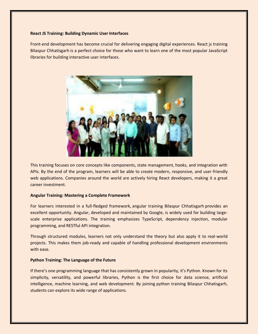 React JS Training: Building Dynamic User Interfaces Front-end development has become crucial for delivering engaging digital experiences. React js training Bilaspur Chhatisgarh is a perfect choice for those who want to learn one of the most popular JavaScript libraries for building interactive user interfaces. This training focuses on core concepts like components, state management, hooks, and integration with APIs. By the end of the program, learners will be able to create modern, responsive, and user-friendly web applications. Companies around the world are actively hiring React developers, making it a great career investment. Angular Training: Mastering a Complete Framework For learners interested in a full-fledged framework, angular training Bilaspur Chhatisgarh provides an excellent opportunity. Angular, developed and maintained by Google, is widely used for building large- scale enterprise applications. The training emphasizes TypeScript, dependency injection, modular programming, and RESTful API integration. Through structured modules, learners not only understand the theory but also apply it to real-world projects. This makes them job-ready and capable of handling professional development environments with ease. Python Training: The Language of the Future If there’s one programming language that has consistently grown in popularity, it’s Python. Known for its simplicity, versatility, and powerful libraries, Python is the first choice for data science, artificial intelligence, machine learning, and web development. By joining python training Bilaspur Chhatisgarh, students can explore its wide range of applications.